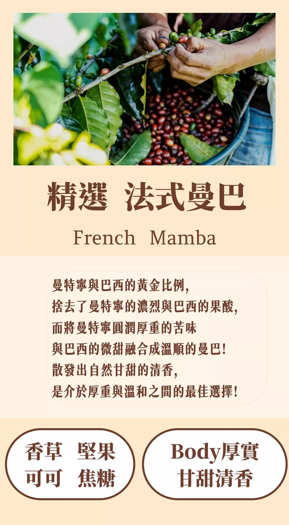 而將曼特寧圓潤厚重的苦味與巴西的微甜融合成溫順的曼巴!